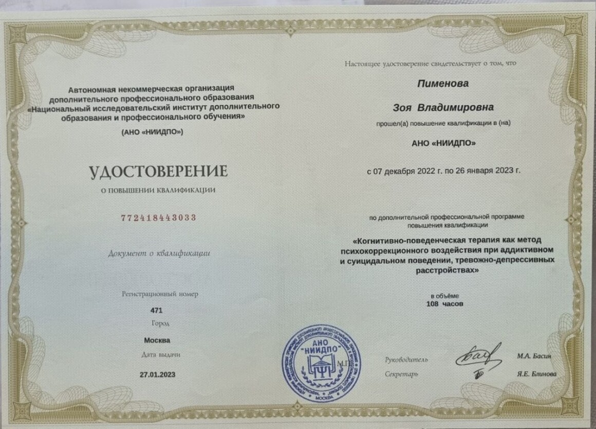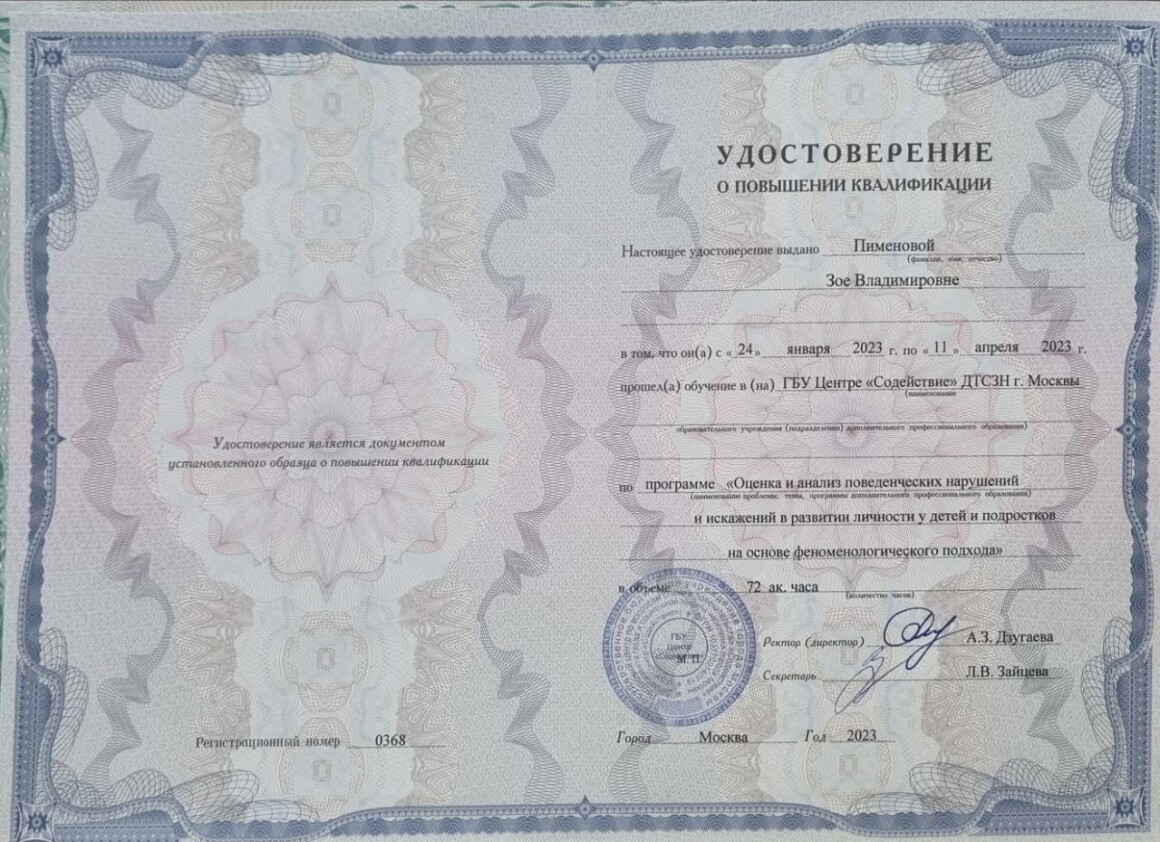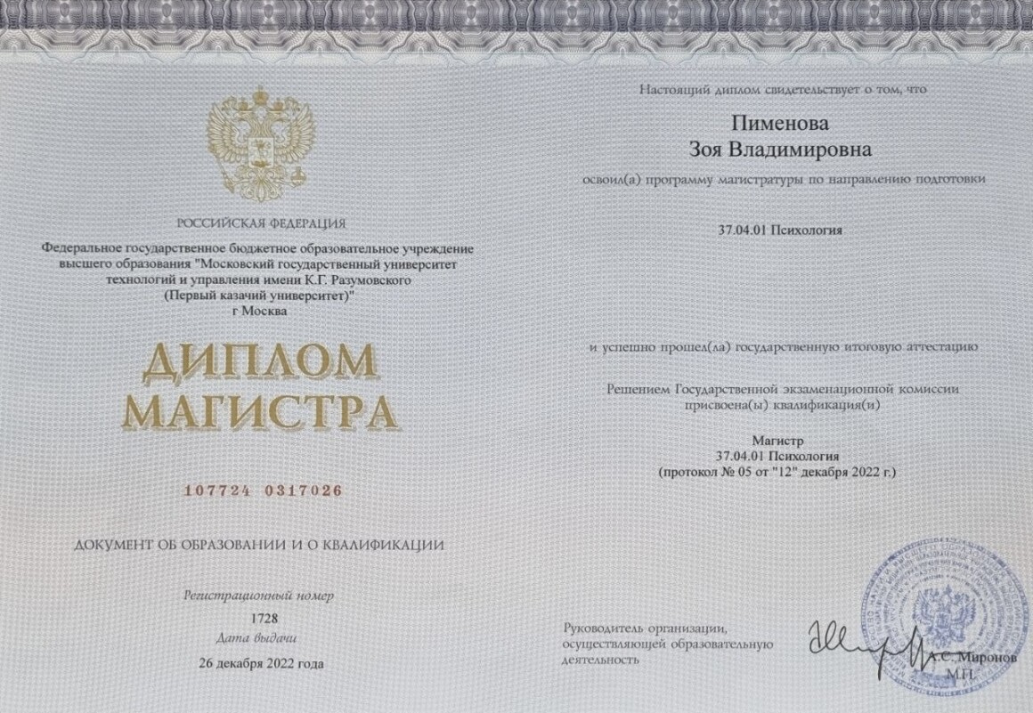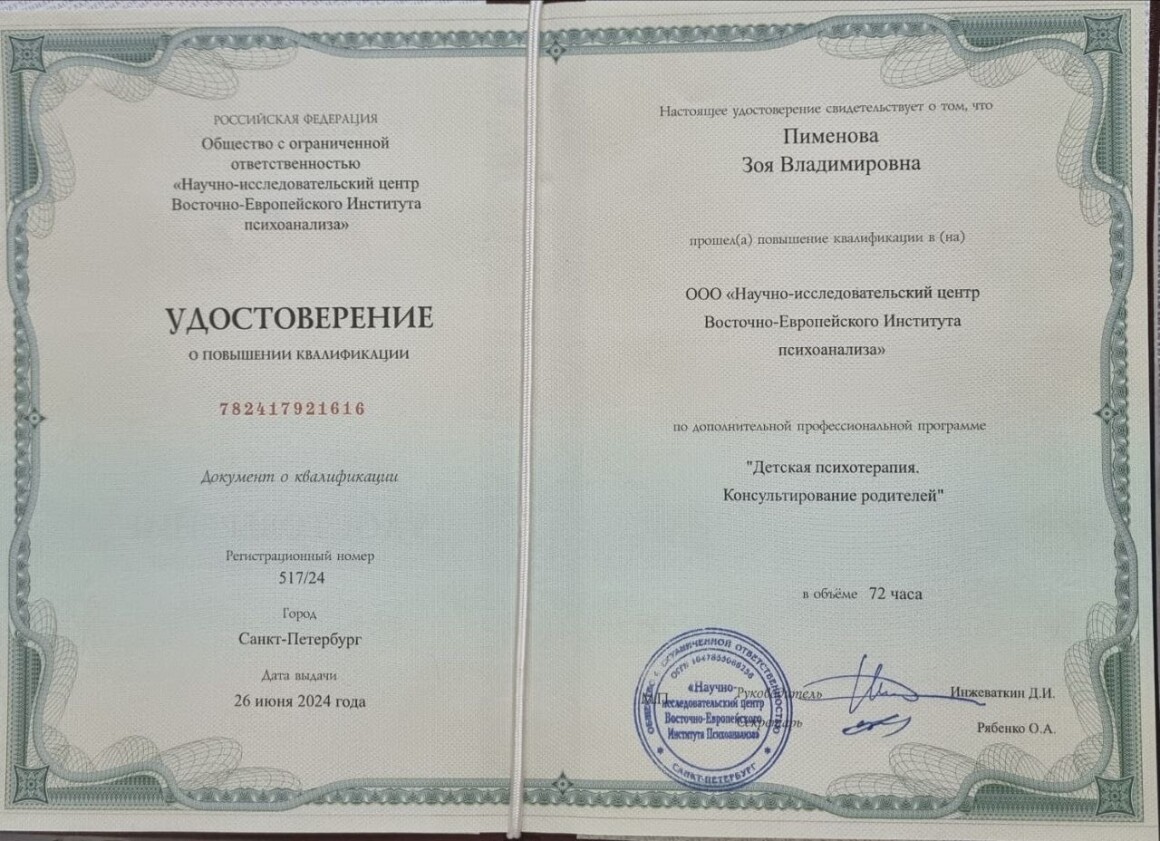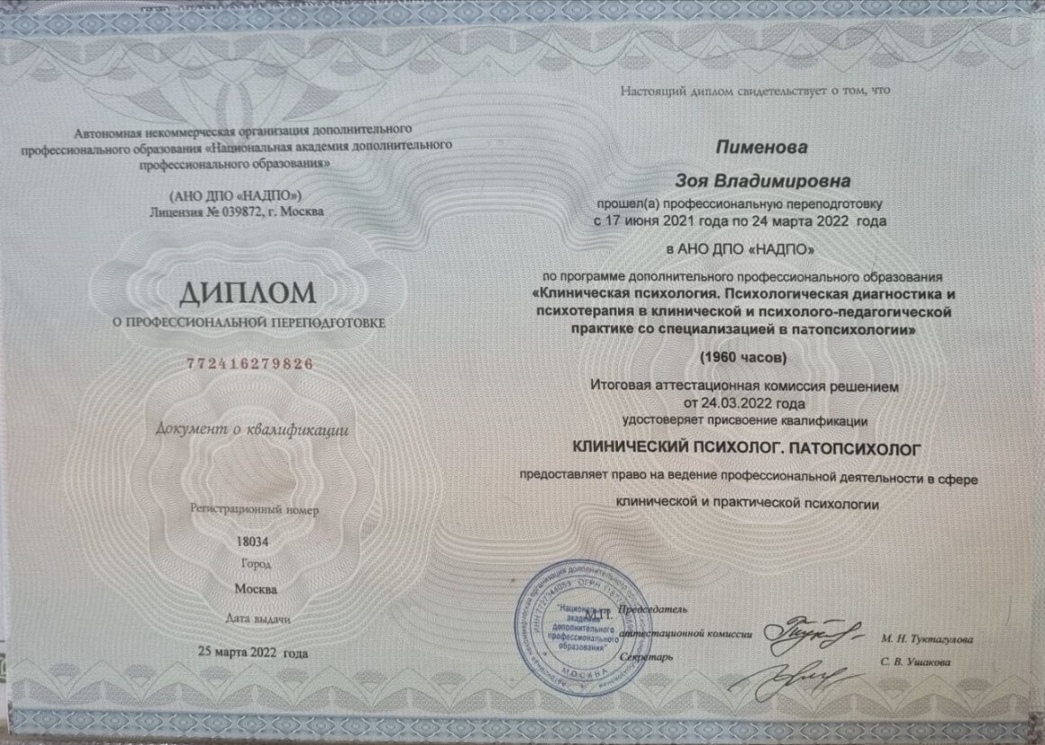 Психолог непрерывно повышает свою квалификацию, совмещая практическую деятельность с научным исследованием и преподаванием. Текущее обучение на магистратуре по направлению «Педагог-психолог» и профессиональная переподготовка подтверждают её стремление быть в курсе современных методик и подходов