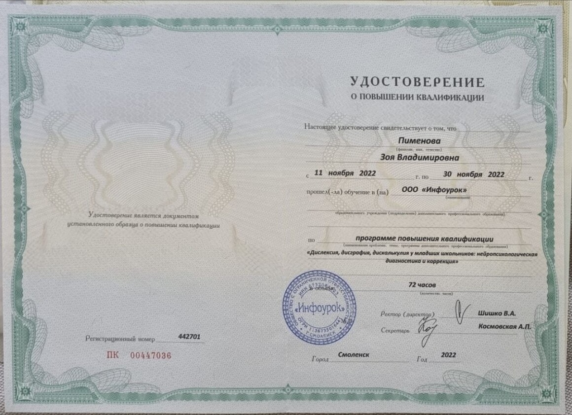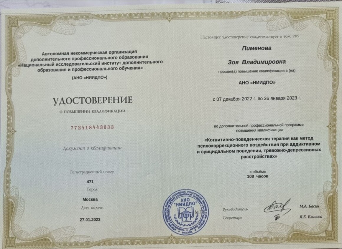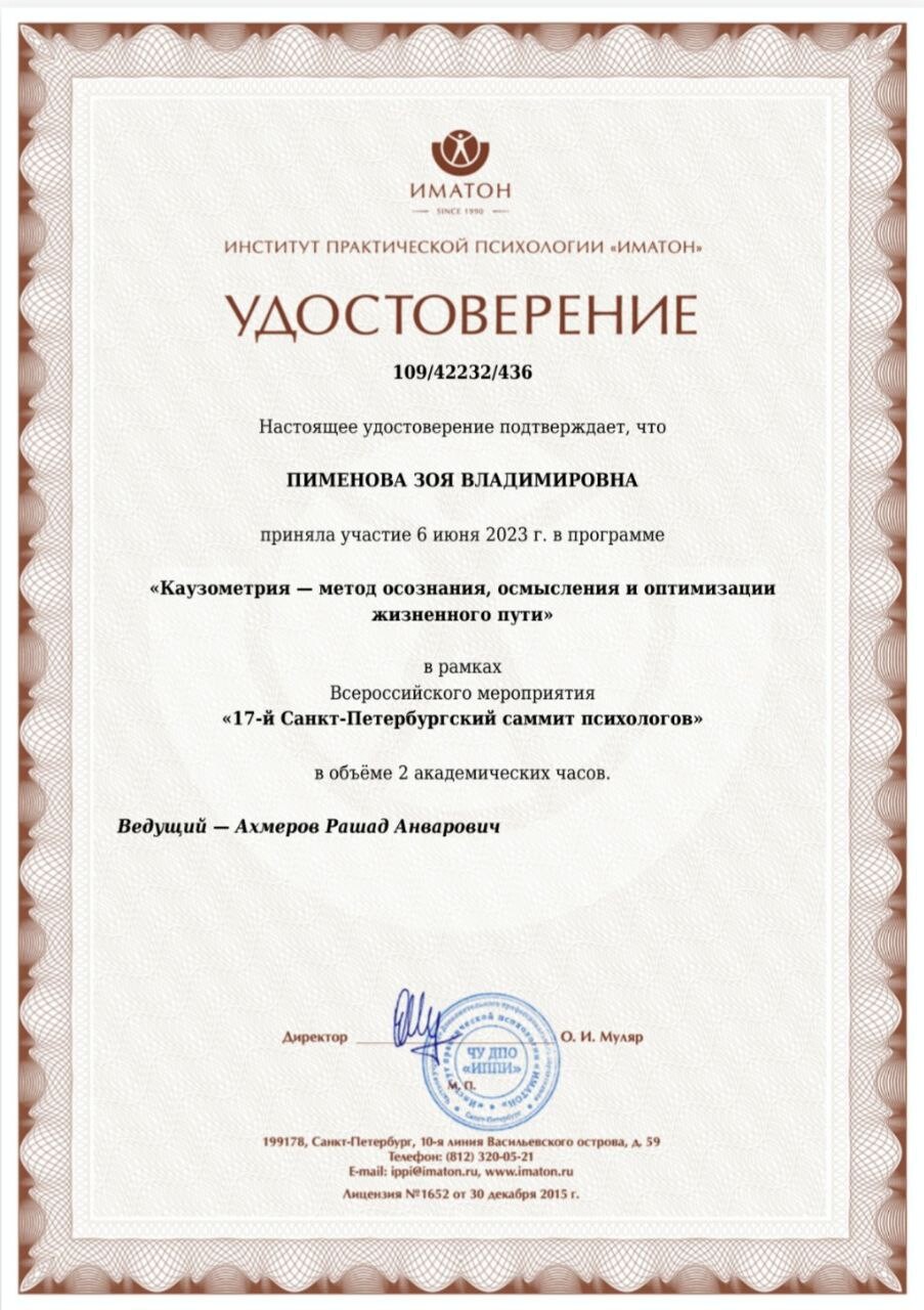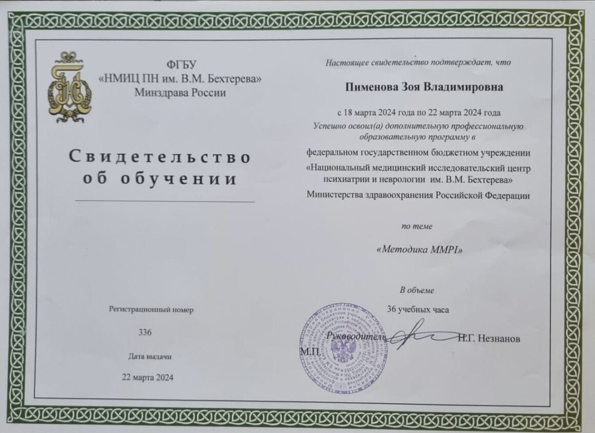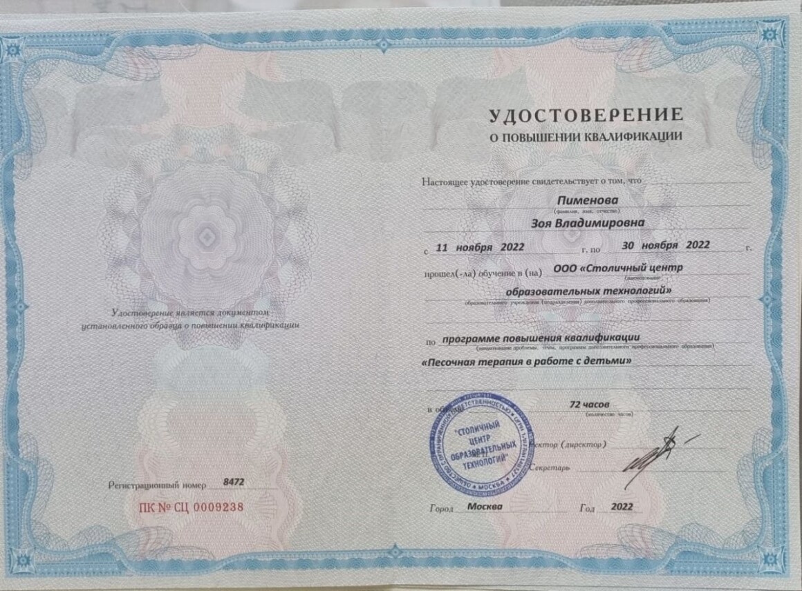 Психолог непрерывно повышает свою квалификацию, совмещая практическую деятельность с научным исследованием и преподаванием. Текущее обучение на магистратуре по направлению «Педагог-психолог» и профессиональная переподготовка подтверждают её стремление быть в курсе современных методик и подходов