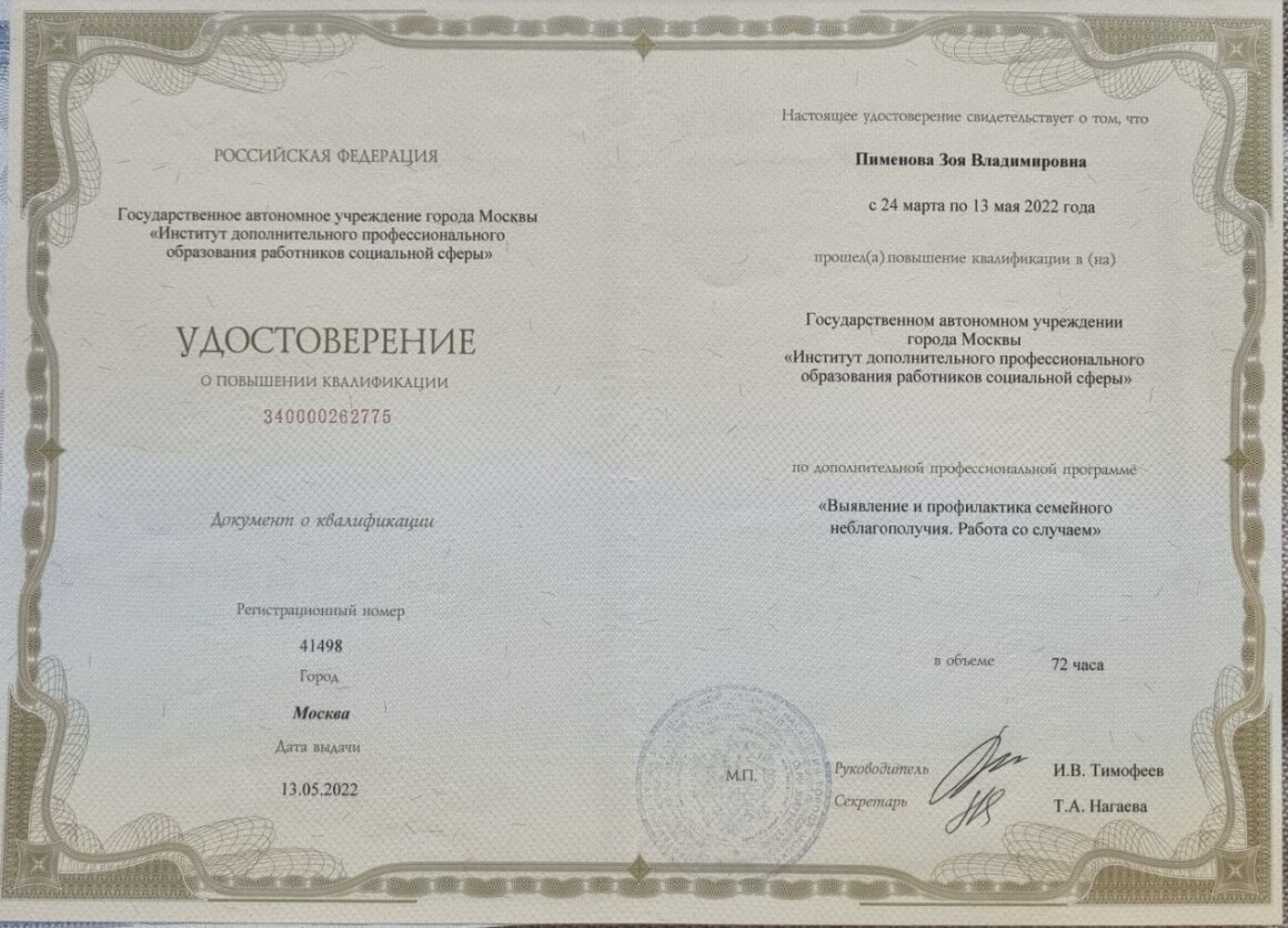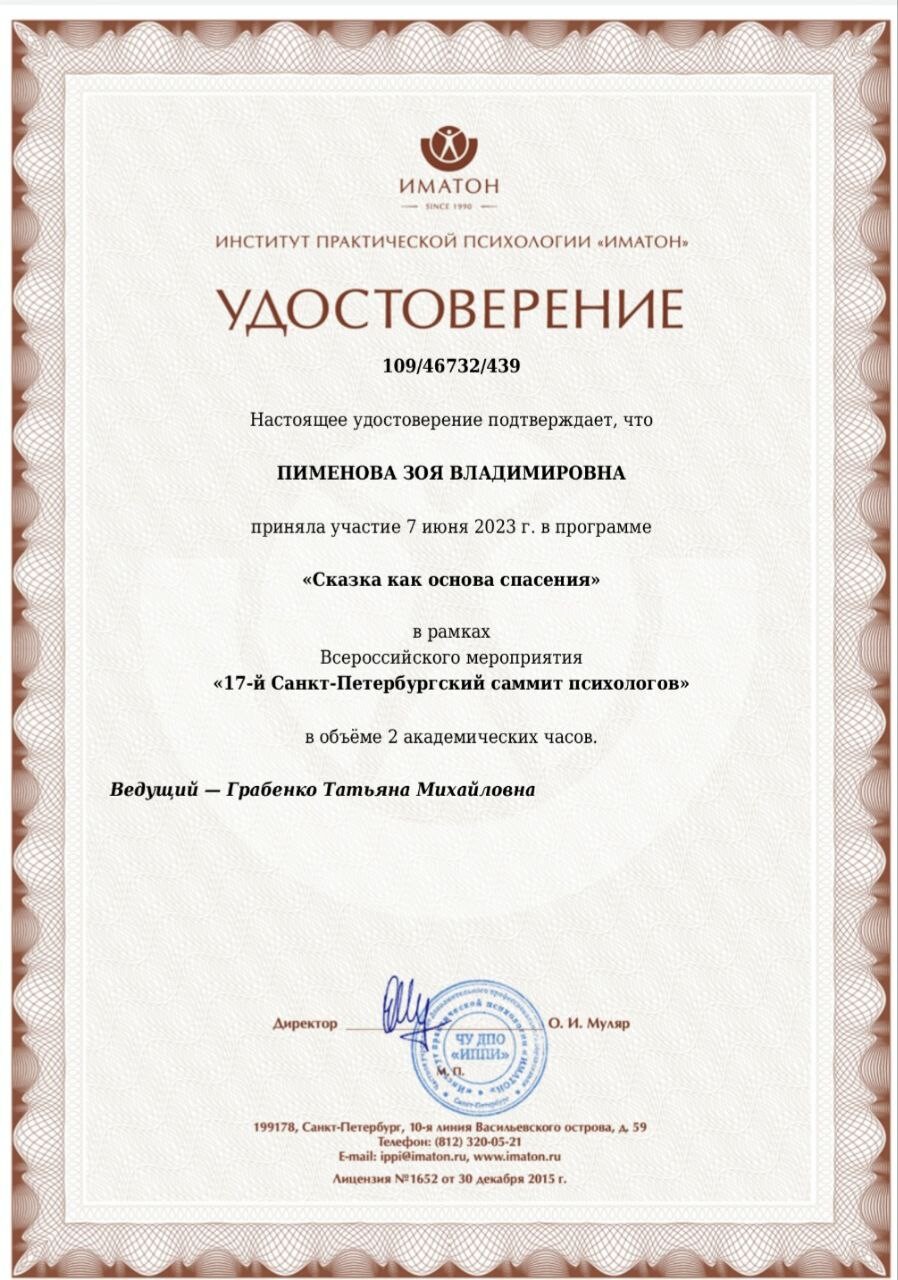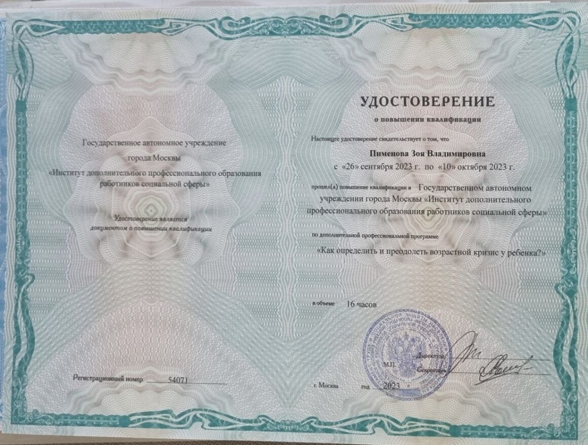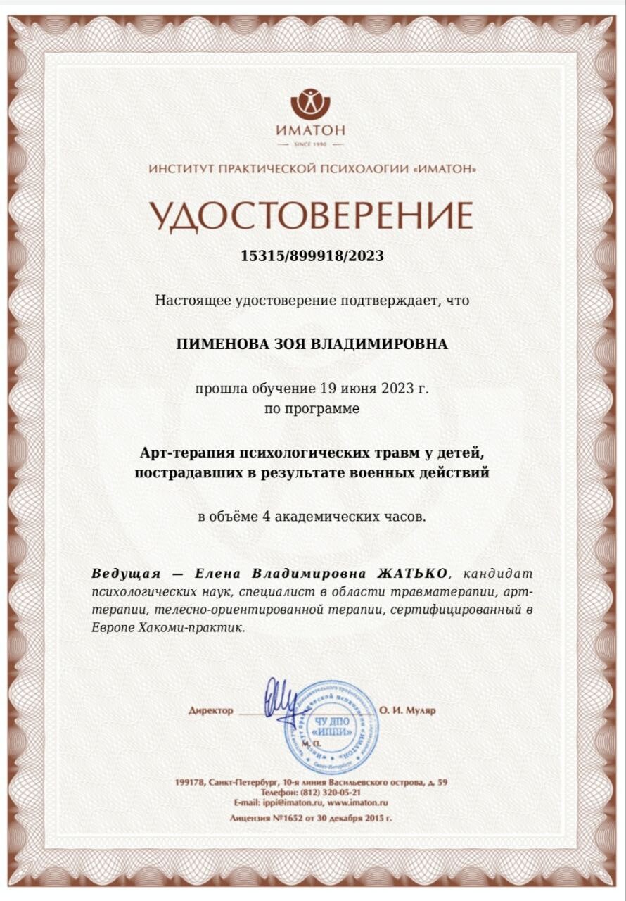 Психолог непрерывно повышает свою квалификацию, совмещая практическую деятельность с научным исследованием и преподаванием. Текущее обучение на магистратуре по направлению «Педагог-психолог» и профессиональная переподготовка подтверждают её стремление быть в курсе современных методик и подходов