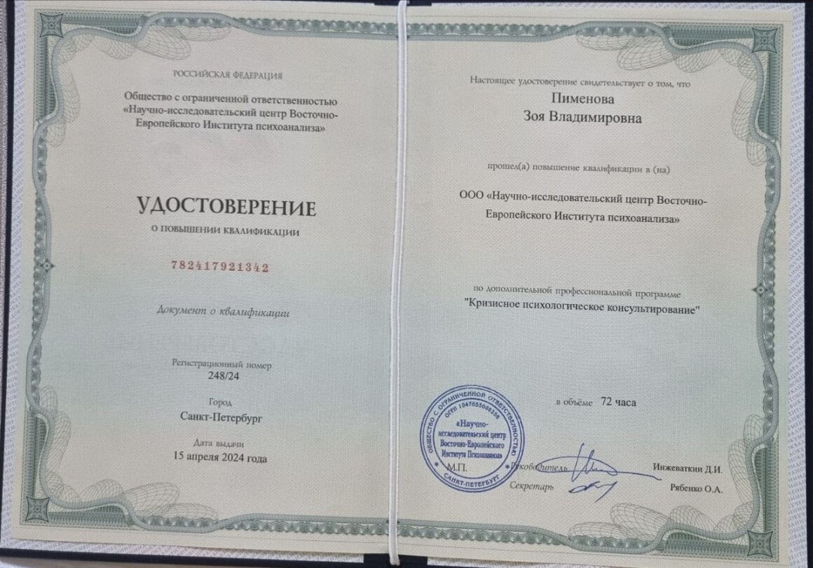 Многолетняя работа в социальной сфере и опыт практики в хосписе позволили Зое Владимировне развить особые навыки кризисного вмешательства и психологической поддержки в сложных жизненных ситуациях